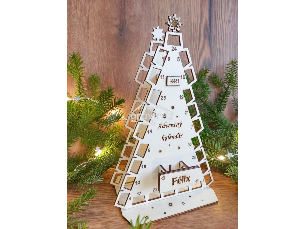 Adventný kalendár je vyrobený z topoľovej preglejky o hrúbke 3 mm. Prirodzená farba dreva. Ručne brúsené a lepené.